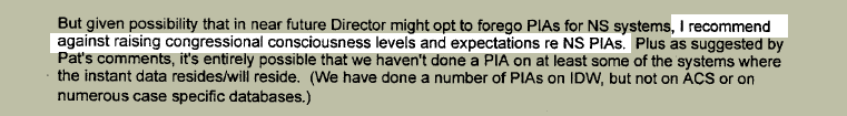 This email was in reply to a May 11 email from Caproni expressing her desire "slide something in about PIA" to a give a "sense that we really do worry about the privacy interests of uninvolved people whose data we slurp up."