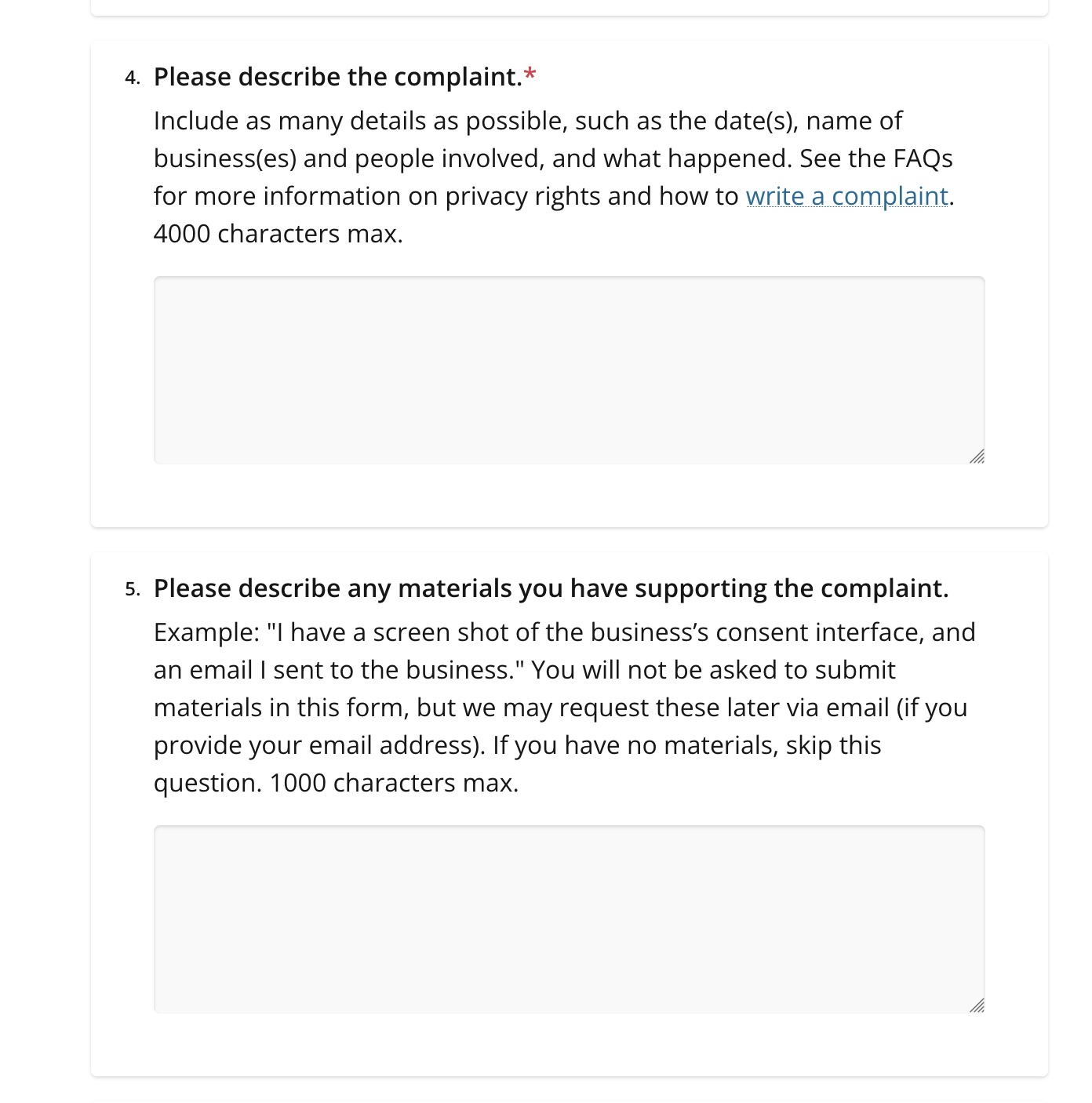 The form will also ask if you’ve directly contacted the business about your complaint. You can just answer yes or no to this question. If it’s an issue such as a company not posting a privacy notice, or something similar, it may not have made sense to contact them directly. But if you made a deletion request, you probably have contacted them about it.