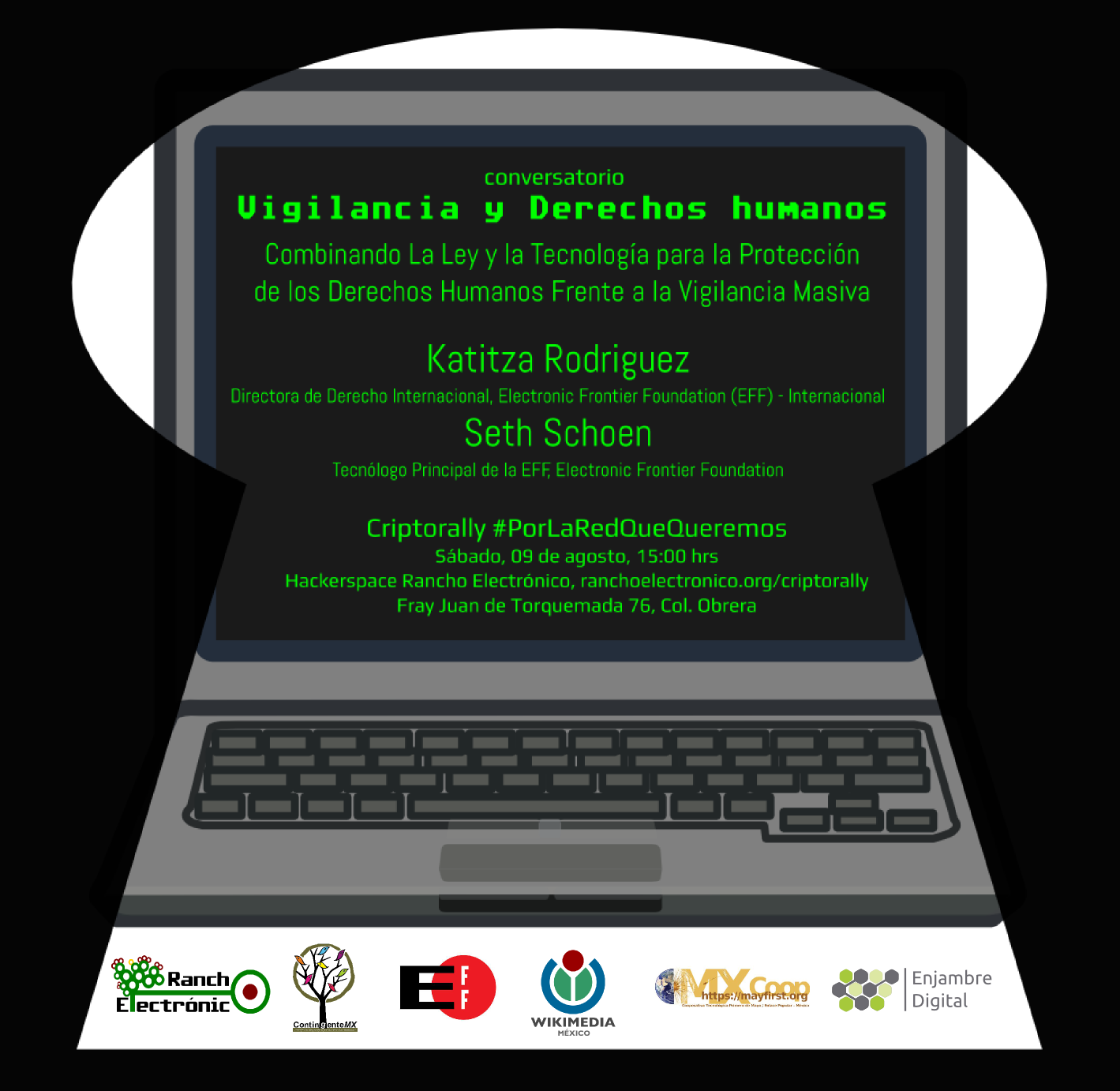 Katitza Rodríguez, Directora de Derecho Internacional de la Electronic Frontier Foundation y Seth Schoen, Tecnólogo Principal de la Electronic Frontier Foundation estarán visitando el Rancho Electrónico el 9 de Agosto del 2014. El título de su ponencia: Vigilancia y Derechos Humanos: Combinando la Ley y la Tecnología para la Protección de los Derechos Humanos frente a la Vigilancia Masiva. Katitza y Seth estarán también en el Rancho Electrónico desde la mañana para atender el Crypto Rally #PorLaRedQueQueremos.