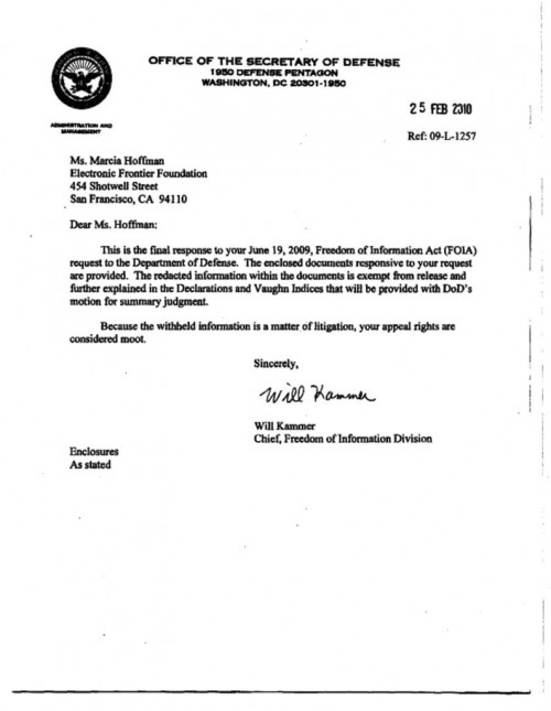 The Department of Defense, also known as the Pentagon after the building in which it is headquartered, is the federal agency responsible for national security and the United States armed forces. It is the largest employer in the world, claiming more than 3 million workers; the Pentagon, in turn, is the largest office building in the world. The Department of Defense is also the federal agency with the most budgetary resources, and regularly accounts for more than half of the United States federal discretionary budget. In 2007, EFF sued the Department of Defense for information about its use of national security letters to gather intelligence within the U.S.