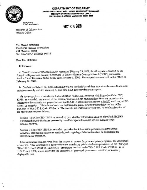 US Northern Command IOB Reports, Cover Letter