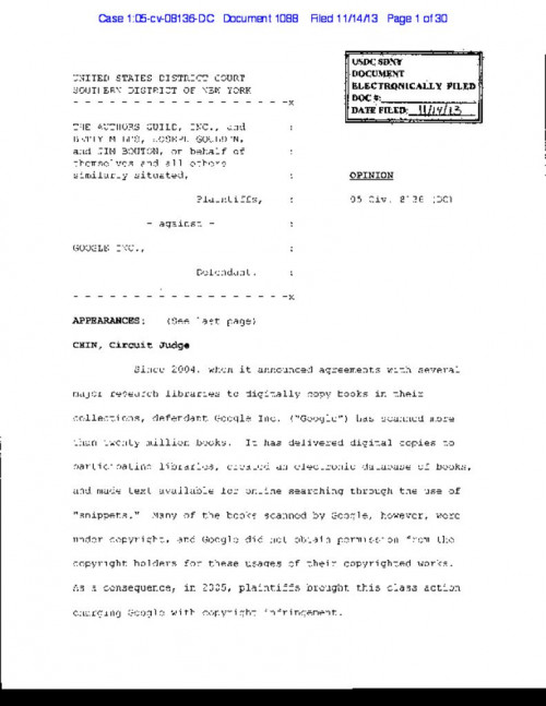The Authors Guild had sued Google in 2005 over Google Books Search.  After a proposed settlement between The Authors Guild and Google was rejected in March 2011, The Authors Guild then sued HathiTrust in September 2011.   Authors Guild v. HathiTrust thus presents a similar issue as the more famous Google Books lawsuit: whether digitization of books is a legal fair use of copyrighted material.  It was a puzzling suit to bring -- if anything, the libraries have an even stronger fair use defense than does Google.