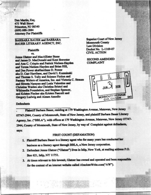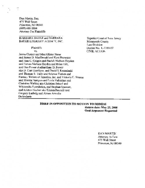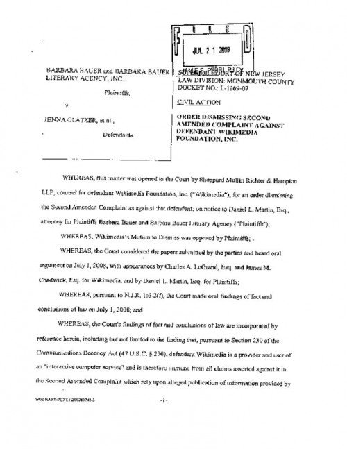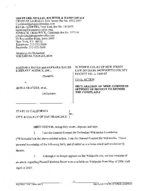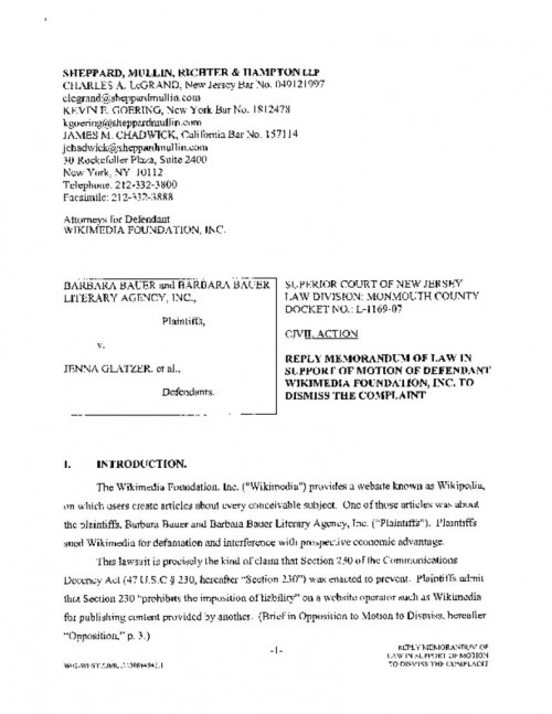 On May 1 2008 EFF and the law firm of Sheppard Mullin Richter & Hampton filed a motion to dismiss a lawsuit brought against the operator of the popular online encyclopedia Wikipedia arguing that federal law immunizes it against suits over statements made by its users.