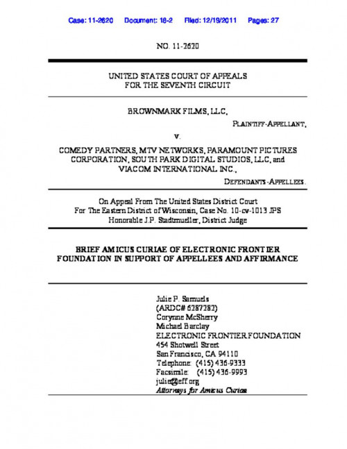 South Park aired the “What What” parody in a 2008 episode critiquing the popularity of absurd online videos. Two years later, copyright owner Brownmark Films sued Viacom and Comedy Central, accusing South Park of infringement. A federal judge dismissed the case, calling it a clear fair use. Brownmark appealed to the 7th U.S Circuit Court of Appeals, claiming that fair use cannot be decided on a motion to dismiss, no matter how obvious. In an amicus brief, EFF argued that Brownmark was asking for a standard that would chill free speech and encourage frivolous litigation.