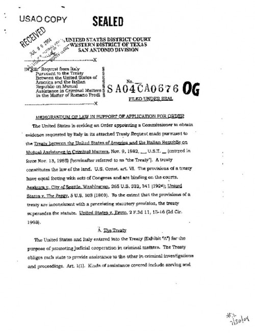Memorandum of law in Support of Application for Order. US Attorney explains the Italian request. The Commissioners Subpoena to Rackspace the Italian request (in Italian) and the Treaty that regulates the request are included as exhibits. - Italian Request for assistance (in English) [203k] 7/30/04