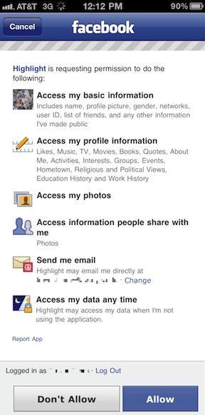 Instead, upon installation, the application tells the user that it requires a connection to her Facebook profile and access to her iPhone's location sensors. Unlike “check in” services like Foursquare, Highlight collects and shares location data with other users continuously unless you manually pause it.