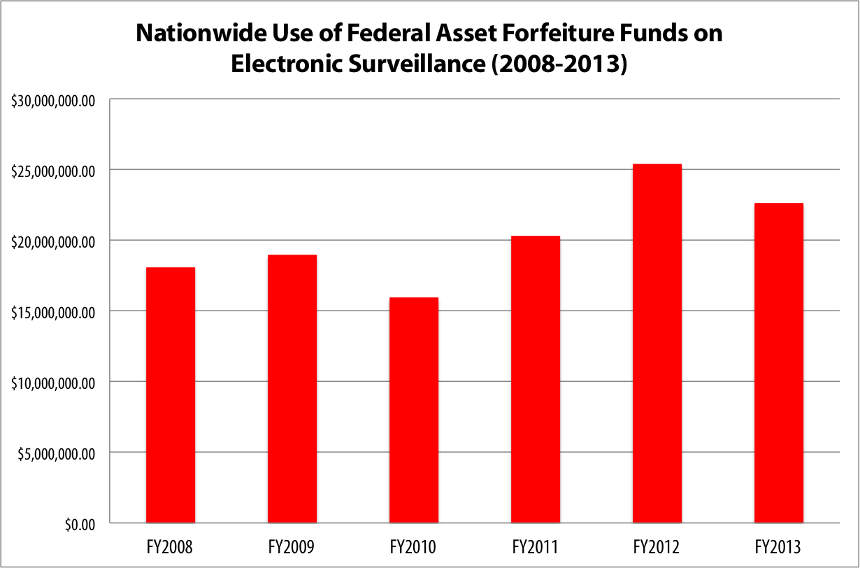 According to data compiled by the Washington Post for the years 2008-2013, law enforcement agencies around the country collectively spent $121 million of federal asset forfeiture funds on electronic surveillance equipment, an annual nationwide average $20.2 million.