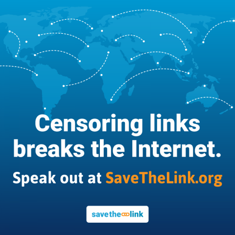 Although these European developments provided the stimulus for the launch of the Save the Link network this week, the site also highlights threats to our freedom to link from three other continents, and will enable participants to publicize and mobilize against new censorship threats as they arise. Social media outreach resources like the one shown above are available on the Save the Link website for you to spread the word and tell policymakers that you stand in solidarity with other users in upholding our freedom to link.