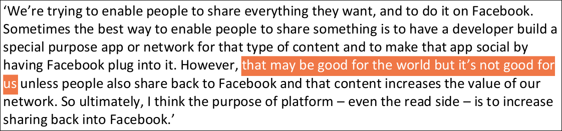 It’s no surprise that a company would prioritize what’s good for it and its profit, but it is a problem when Facebook tramples user rights and innovation to get there. And while Facebook demanded reciprocity from its developers, it withheld access from its competitors.