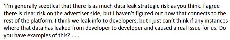 That defense fails, because it doesn’t address the core issues. Sure, Facebook does not sell user data directly to advertisers. It doesn’t have to. Facebook has tried to exchange access to users and their information in other ways. In another striking example from the documents, Facebook appeared to offer Tinder privileged access during the API transition in return for use of Tinder’s trademarked term “Moments.” And, of course, Facebook keeps the lights on by selling access to specific users’ attention in the form of targeted advertising spots.