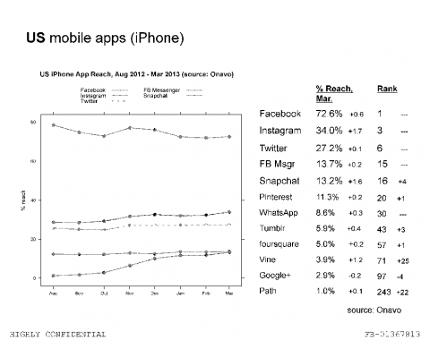 A "highly confidential" slide showing Onavo stats for other major apps.