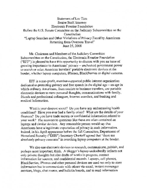Document | June 25, 2008 Congressional testimony on border searches from EFF's Lee Tien Read more about Congressional testimony on border searches from EFF's Lee Tien