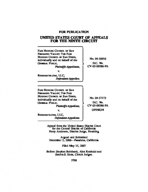 Document | May 15, 2007 Fair Housing Council of San Fernando Valley v. Roommate.com 489 F.3d 921- (9th Cir. 2007) Read more about Fair Housing Council of San Fernando Valley v. Roommate.com