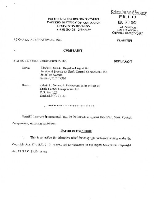 Document | December 20, 2002 Complaint in Lexmark v. Static Control Components Read more about Complaint in Lexmark v. Static Control Components