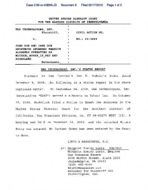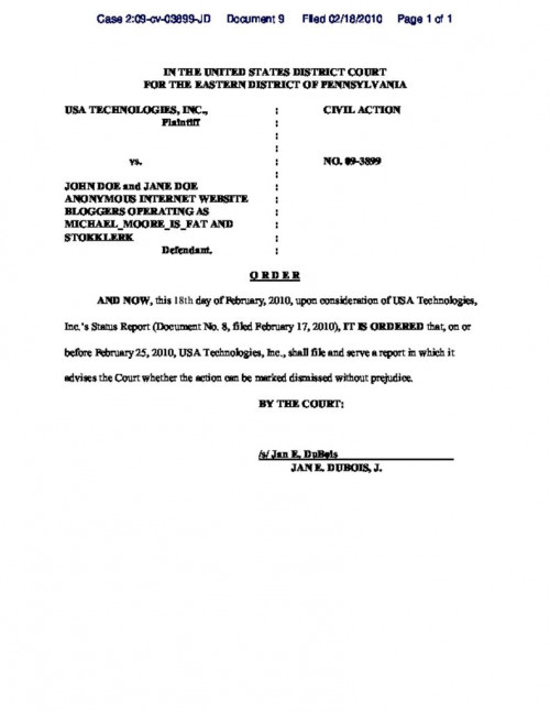 Document | February 18, 2010 Eastern District of Pennsylvania Order Requiring a Status Report Regarding Potential Dismissal Read more about Eastern District of Pennsylvania Order Requiring a Status Report Regarding Potential Dismissal