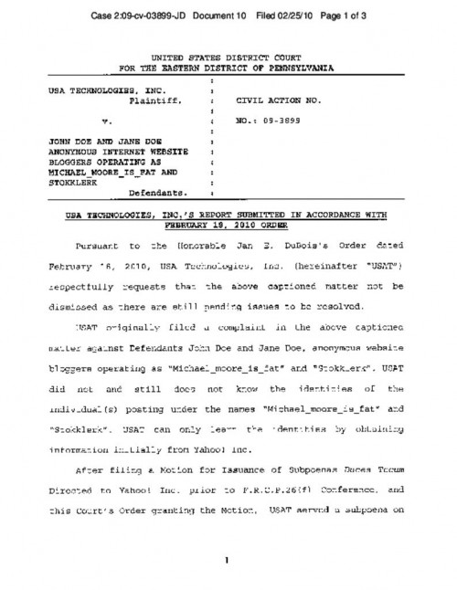 Document | March 1, 2010 Eastern District of Pennsylvania Order Requiring a Status Report Regarding Potential Dismissal Read more about Eastern District of Pennsylvania Order Requiring a Status Report Regarding Potential Dismissal