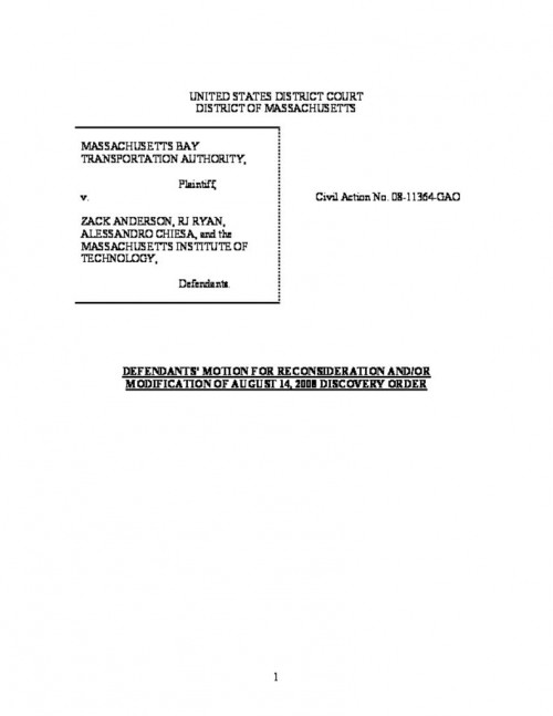 Document | August 17, 2008 Defendants' motion for reconsideration and/or modification of discovery order Read more about Defendants' motion for reconsideration and/or modification of discovery order