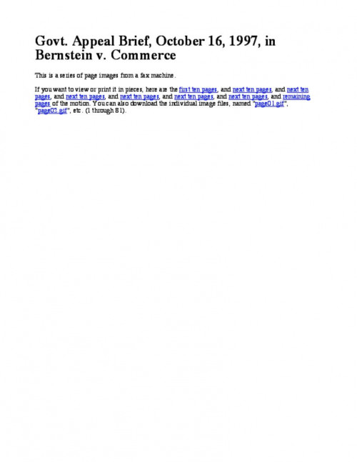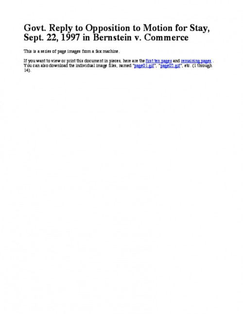 Bernstein's brief opposing the govt. emergency motion for stay-pending-appeal of all relief granted by the District Court. Brief clearly shows that govt. has introduced no new arguments in its favor, and cannot meet the tests required for such a stay (among them a clear showing of liklihood...