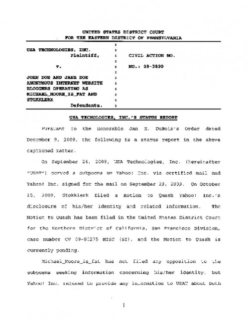 Document | December 10, 2009 Eastern District of Pennsylvania Order Seeking Status Report on Discovery Request Read more about Eastern District of Pennsylvania Order Seeking Status Report on Discovery Request