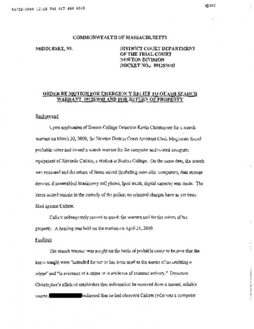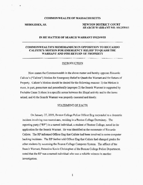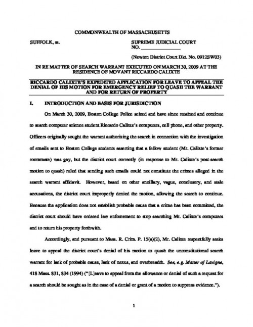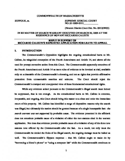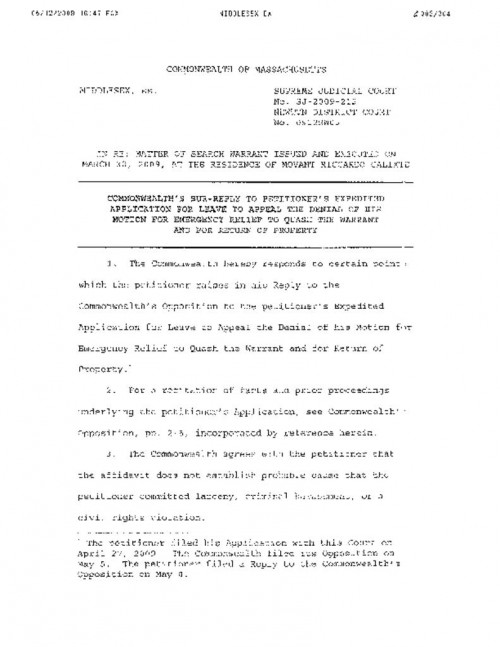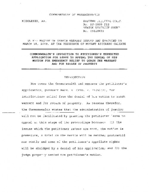 Document | May 4, 2009 Commonwealth's Opposition to Calixte's Expedited Application for Leave to Appeal Read more about Commonwealth's Opposition to Calixte's Expedited Application for Leave to Appeal