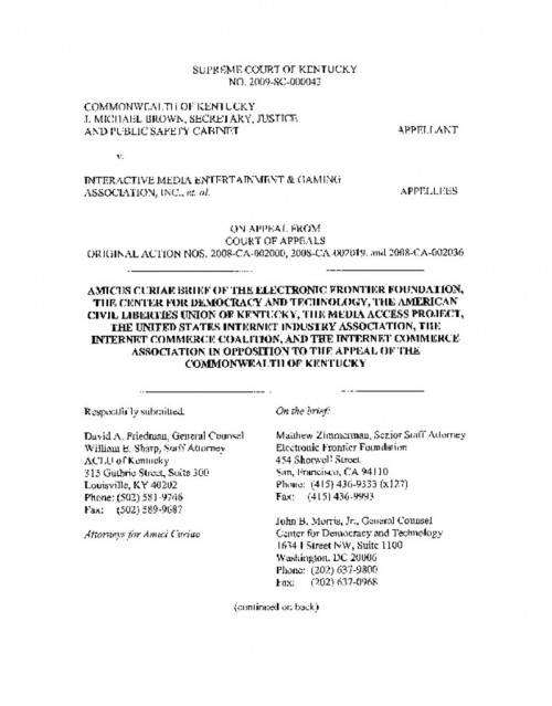 Document | April 17, 2009 Amicus Brief of EFF, CDT, and the ACLU of Kentucky et. al. In Opposition to the Commonwealth's Supreme Court Appeal Read more about Amicus Brief of EFF, CDT, and the ACLU of Kentucky et. al. In Opposition to the Commonwealth's Supreme Court Appeal