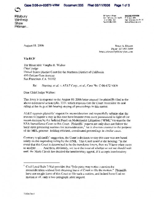 Document | August 11, 2006 AT&T's response to EFF's letter requesting limited discovery Read more about AT&T's response to EFF's letter requesting limited discovery