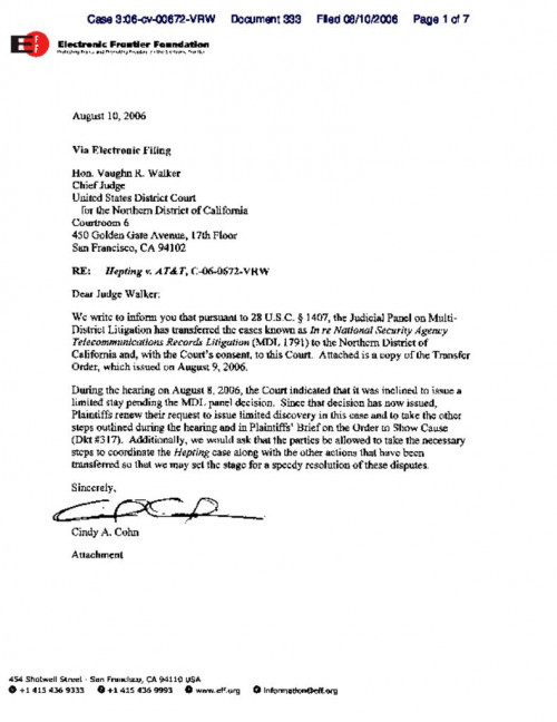 Document | August 10, 2006 EFF letter requesting limited discovery after MDL decision Read more about EFF letter requesting limited discovery after MDL decision