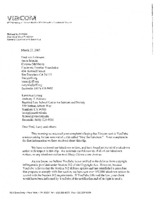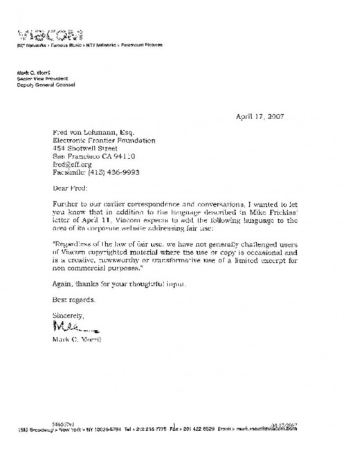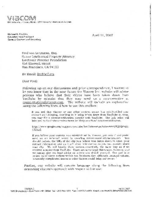 Document | September 24, 2007 April 11th Letter from Viacom Read more about April 11th Letter from Viacom