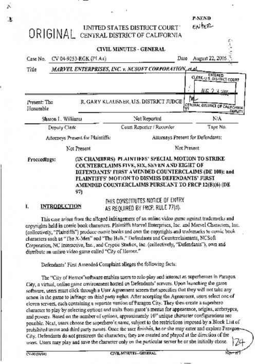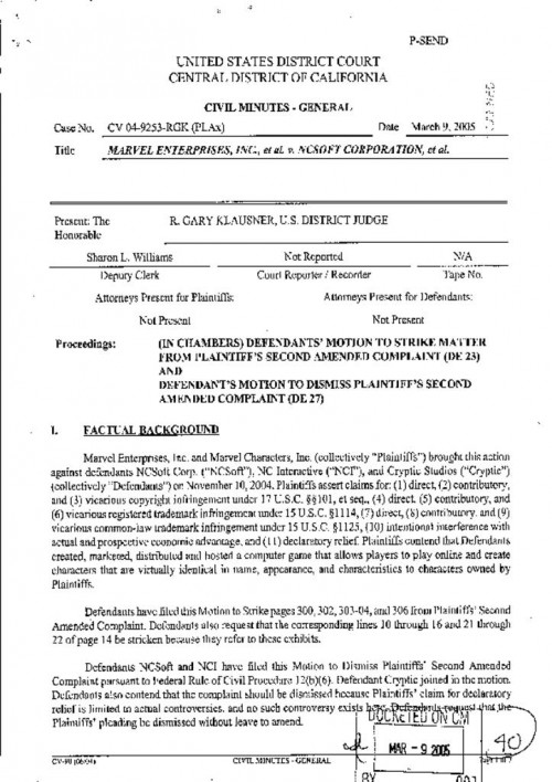 Document | March 9, 2005 District court order granting in part NCSoft's motions to dismiss and strike copyright and trademark claims Read more about District court order granting in part NCSoft's motions to dismiss and strike copyright and trademark claims