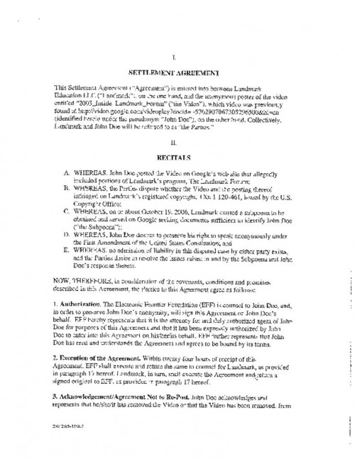 Document | November 28, 2006 Settlement agreement between Landmark Education and John Doe Read more about Settlement agreement between Landmark Education and John Doe