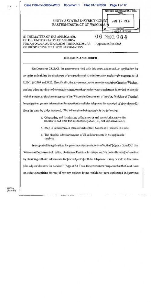 Document | January 17, 2006 Court Order Denying Government Request for Cell Phone Tracking Read more about Court Order Denying Government Request for Cell Phone Tracking