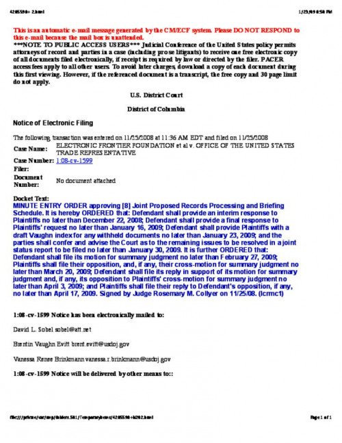 Document | November 25, 2008 Minute Entry Order approving Joint Proposed Records Processing and Briefing Schedule Read more about Minute Entry Order approving Joint Proposed Records Processing and Briefing Schedule