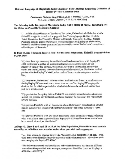 Document | April 26, 2002 Order that compelling ReplayTV to modify its software to send back information on on the use of its device by by its customers. Read more about Order that compelling ReplayTV to modify its software to send back information on on the use of its device by by its customers.