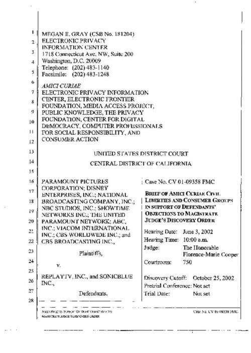 Document | July 16, 2007 EPIC and EFF's brief amicus curiae in support of ReplayTV's opposition to disclose information on the use of its device by by i Read more about EPIC and EFF's brief amicus curiae in support of ReplayTV's opposition to disclose information on the use of its device by by i