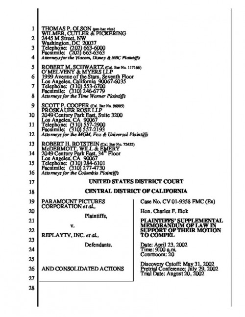 Document | November 21, 2001 Amended Complaint filed by Paramount, Disney, NBC, Showtime, ABC, Viacom & CBS, in Paramount Pictures Corp. et al. v. Replay Read more about Amended Complaint filed by Paramount, Disney, NBC, Showtime, ABC, Viacom & CBS, in Paramount Pictures Corp. et al. v. Replay