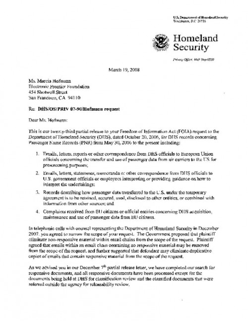 Letter accompanying DHS' March 28, 2010 release of documents related to EU-US passenger data sharing agreement....