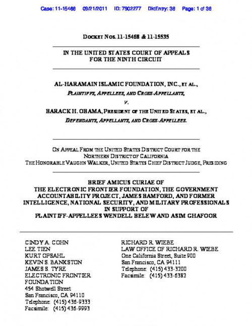 Document | September 21, 2011 Amicus brief of EFF, joined by whistleblowers, intelligence experts, and veterans Read more about Amicus brief of EFF, joined by whistleblowers, intelligence experts, and veterans