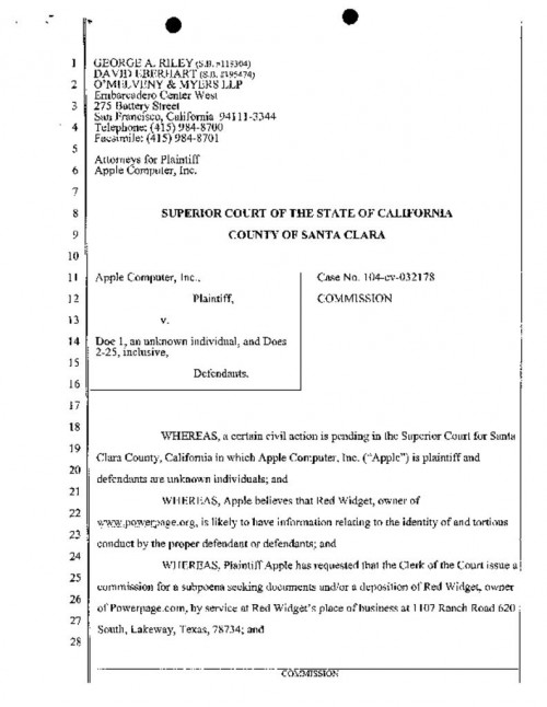 Document | September 13, 2007 Commission to Texas Court re Subpoena to Red Widget (PowerPage's ISP) Read more about Commission to Texas Court re Subpoena to Red Widget (PowerPage's ISP)