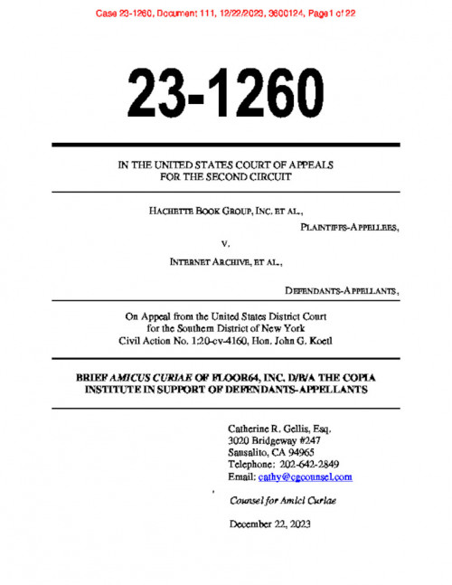 Document | December 22, 2023 Hachette v. Internet Archive - Amicus brief of Copia Institute Read more about Hachette v. Internet Archive - Amicus brief of Copia Institute