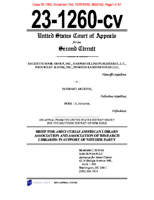 Document | December 21, 2023 Hachette v. Internet Archive - Amicus brief of American Library Association and Association of Research Libraries Read more about Hachette v. Internet Archive - Amicus brief of American Library Association and Association of Research Libraries
