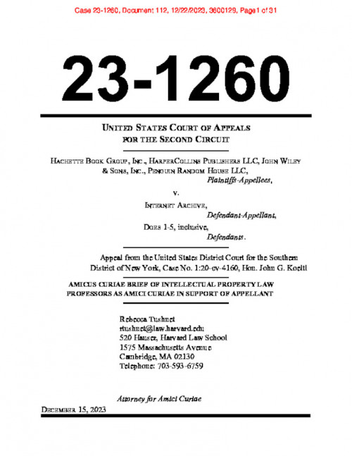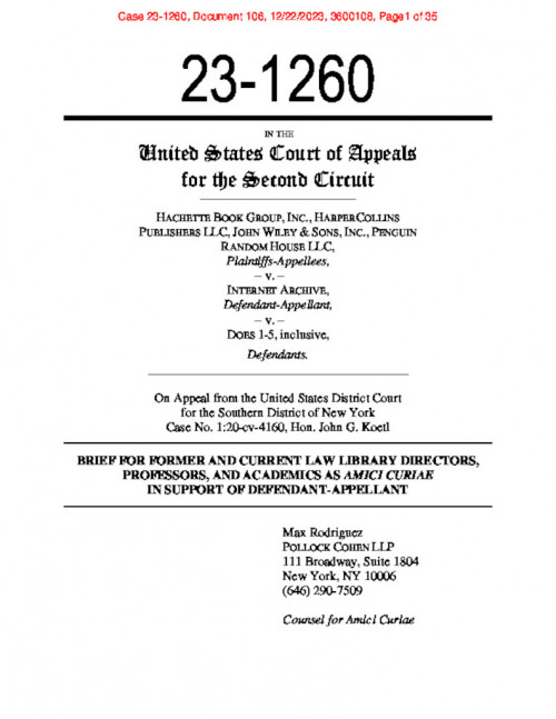 Document | December 21, 2023 Hachette v. Internet Archive - Law Librarians and Academics Amicus Brief Read more about Hachette v. Internet Archive - Law Librarians and Academics Amicus Brief