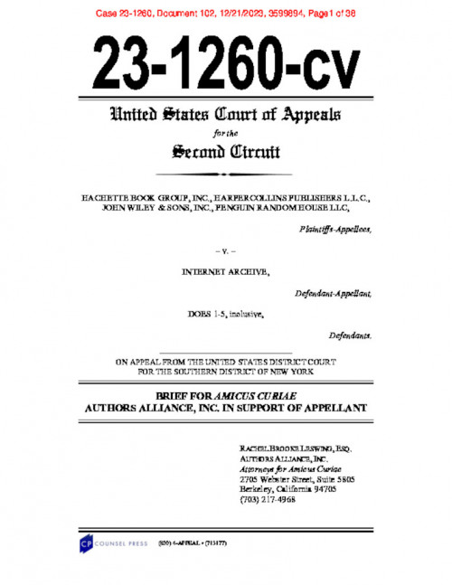 Document | December 21, 2023 Hachette v. Internet Archive - Amicus brief of Authors Alliance Read more about Hachette v. Internet Archive - Amicus brief of Authors Alliance
