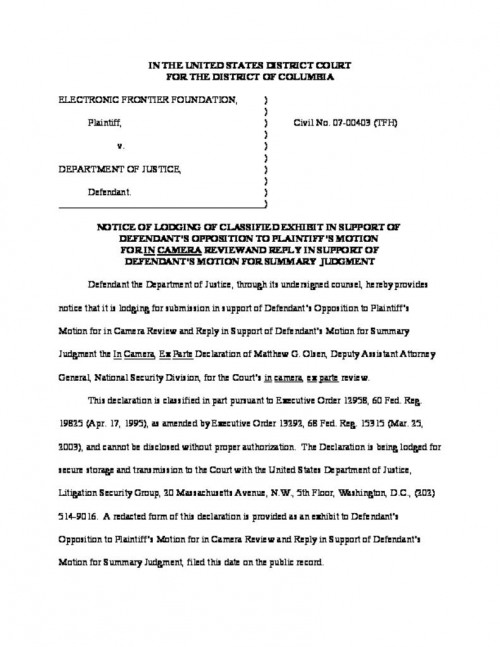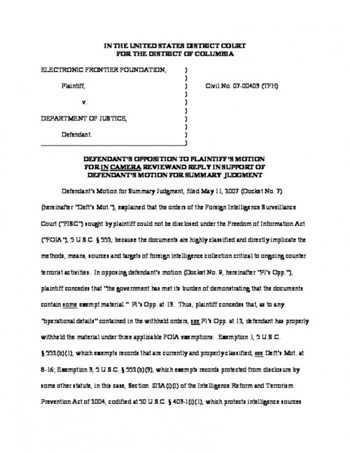 The DOJ argues that there is no reason for a judge to review the documents unless EFF can argue, with evidence, that the DOJ has improperly withheld some information.