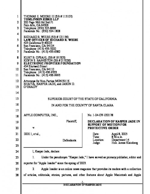Document | September 13, 2007 Declaration of Kasper Jade (Apple Insider) Read more about Declaration of Kasper Jade (Apple Insider)
