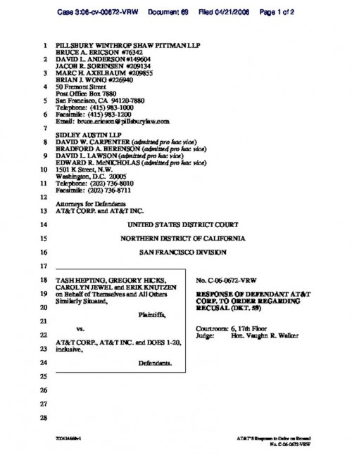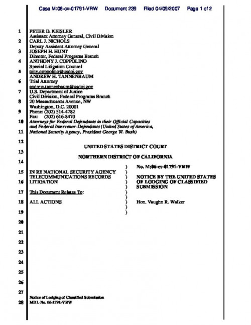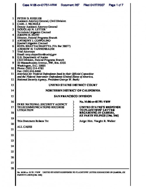 Document | April 27, 2007 U.S. response to plaintiffs' letter re: classified filings Read more about U.S. response to plaintiffs' letter re: classified filings