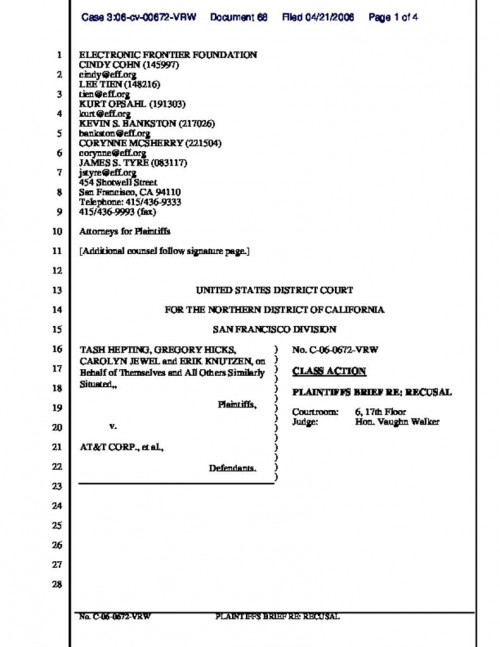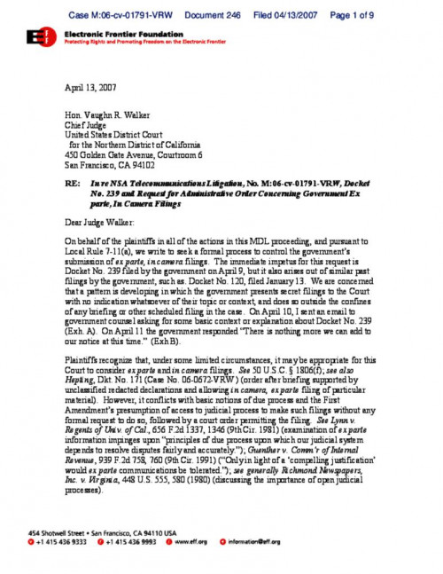 Document | April 13, 2007 Plaintiffs' request re: government ex parte, In Camera filings Read more about Plaintiffs' request re: government ex parte, In Camera filings