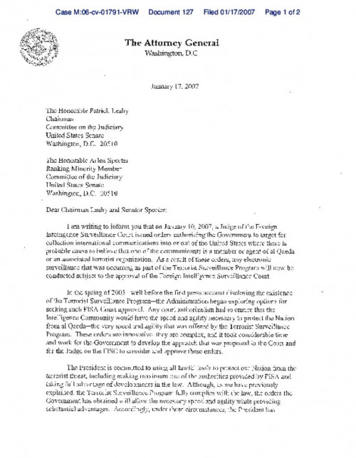 Document | January 17, 2007 Attorney General's letter to Congress Read more about Attorney General's letter to Congress
