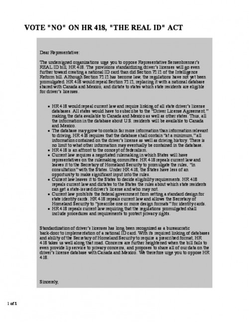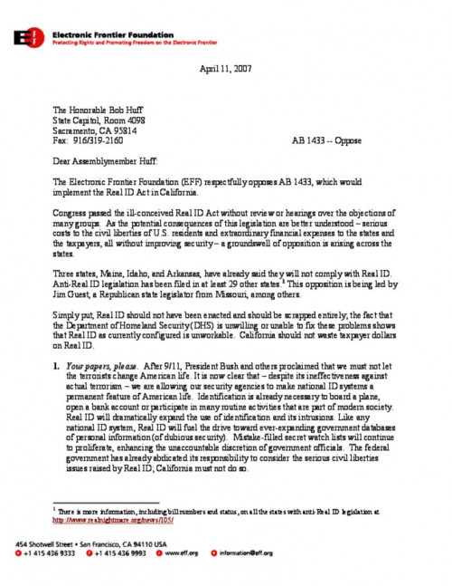 Document | April 11, 2007 EFF letter opposing to AB 1433, which would implement the Real ID Act in California Read more about EFF letter opposing to AB 1433, which would implement the Real ID Act in California
