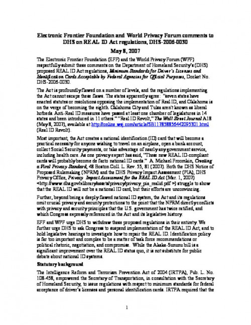 Document | May 8, 2007 Comments of the Electronic Frontier Foundation and the World Privacy Forum on the DHS REAL ID regulations Read more about Comments of the Electronic Frontier Foundation and the World Privacy Forum on the DHS REAL ID regulations