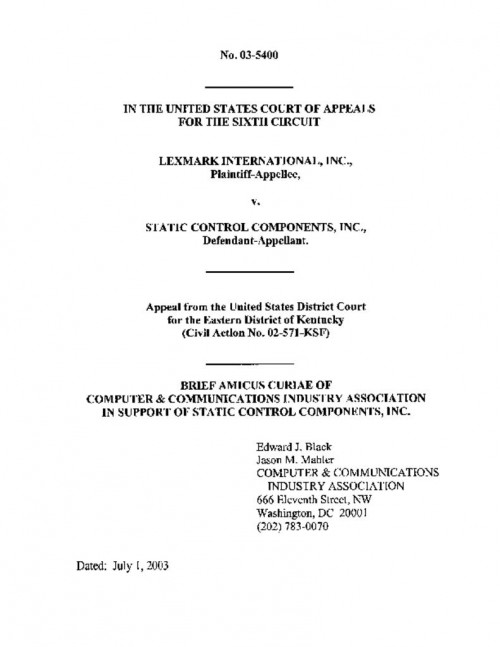 Document | July 1, 2003 Brief Amicus Curiae of Computer & Communications Industry Association In Support of Static Control Components, Inc. Read more about Brief Amicus Curiae of Computer & Communications Industry Association In Support of Static Control Components, Inc.